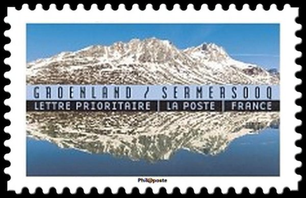 Le Groenland est la plus grande île du monde avec une superficie de 2,16 millions de km². Il compte environ 56 000 habitants, dont près de 19 000 vivent à Nuuk, la capitale. Environ 80 % du territoire est recouvert de glace, avec une épaisseur pouvant atteindre 3 000 mètres. Les températures peuvent descendre jusqu'à -50 °C en hiver. Le timbres présenté a été émis en 2017 (Y&T AD1369) - (Lettre prioritaire) polychrome, sans valeur indiquée. Pour l'année du tourisme durable. "Semersooq, Groenland". 2 bandes de phosphore. Emis en carnet autoadhésif....